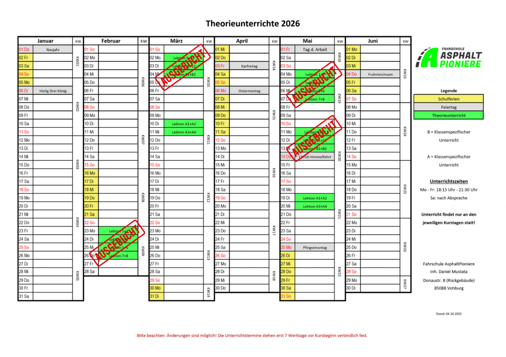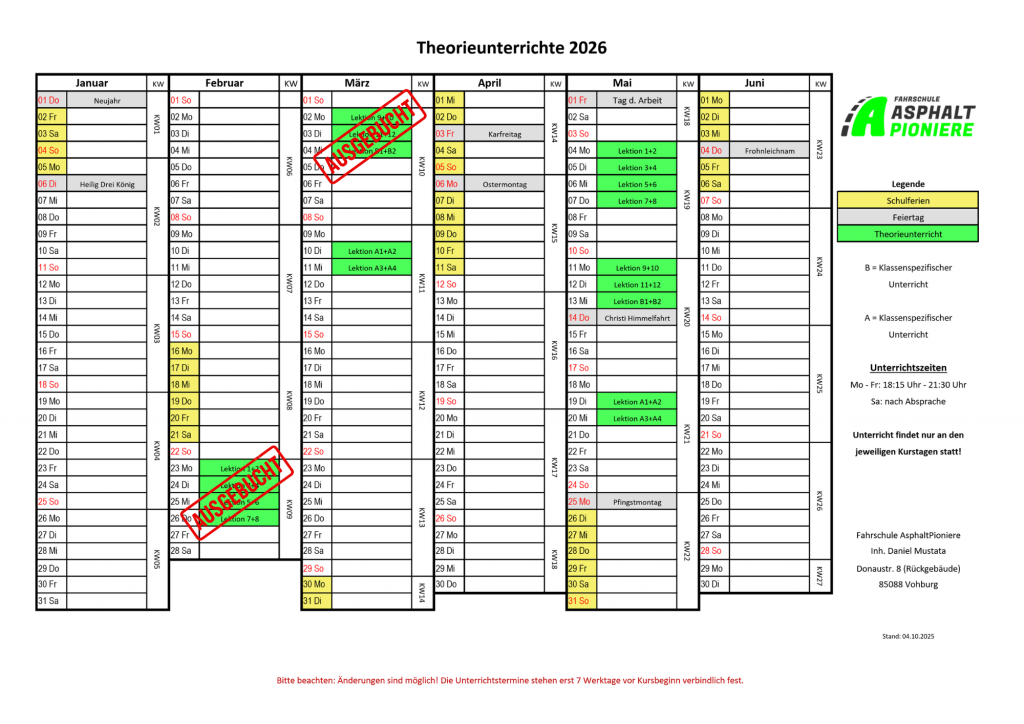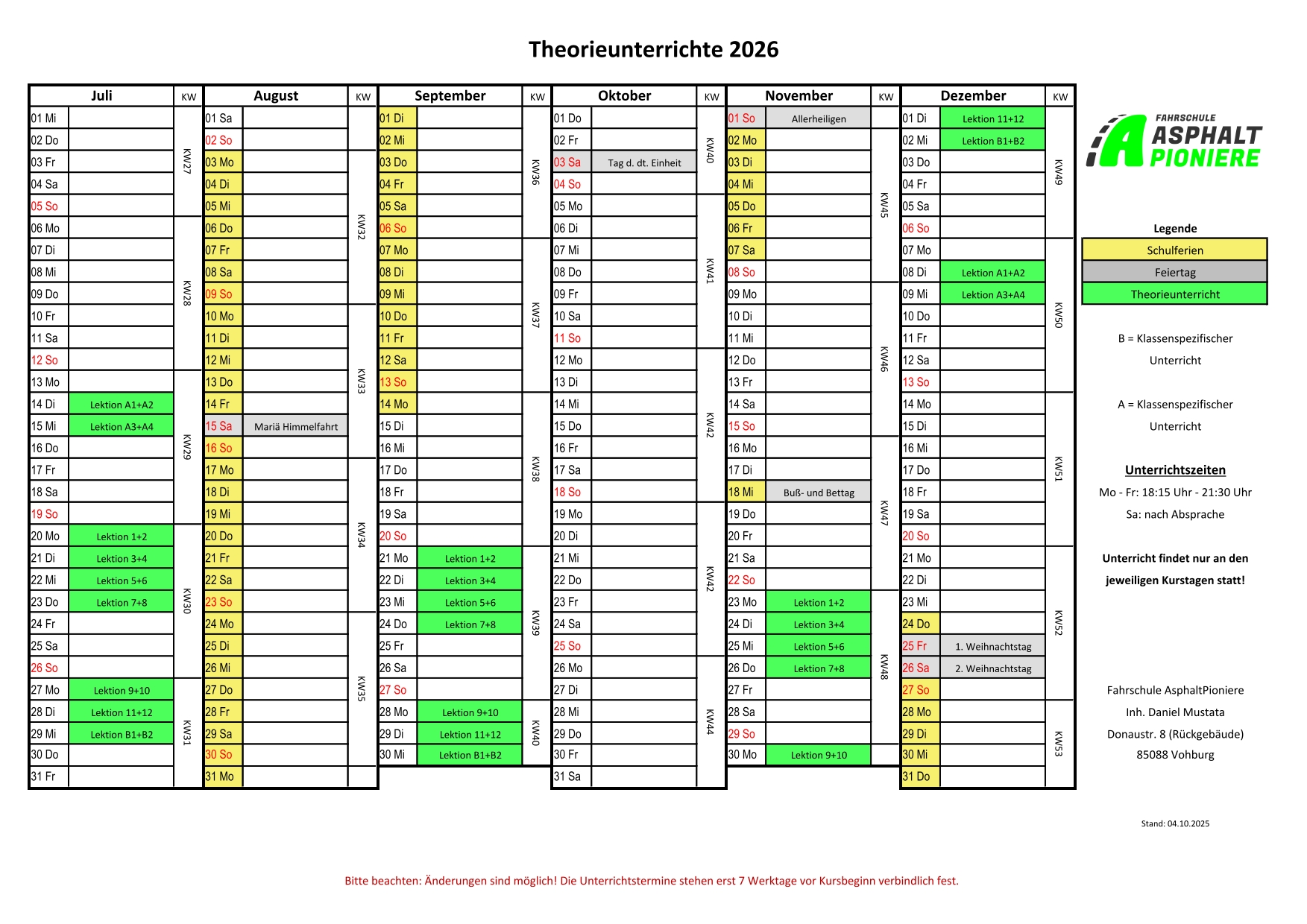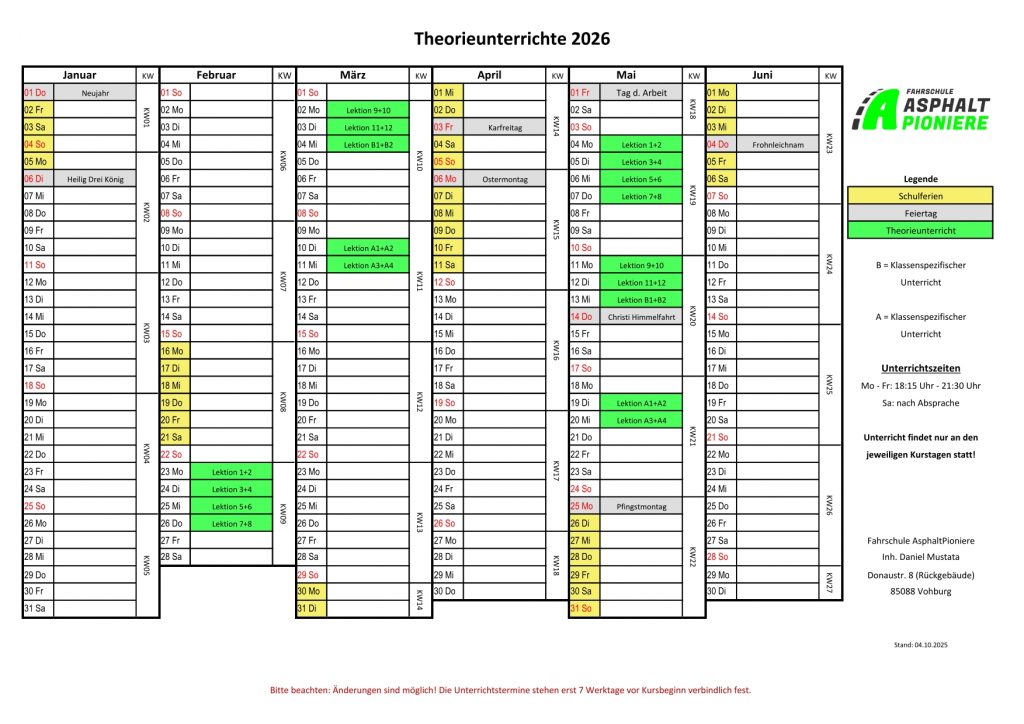 Hier findest Du unseren Theorieunterrichtsplan mit allen Terminen der Unterrichtseinheiten.